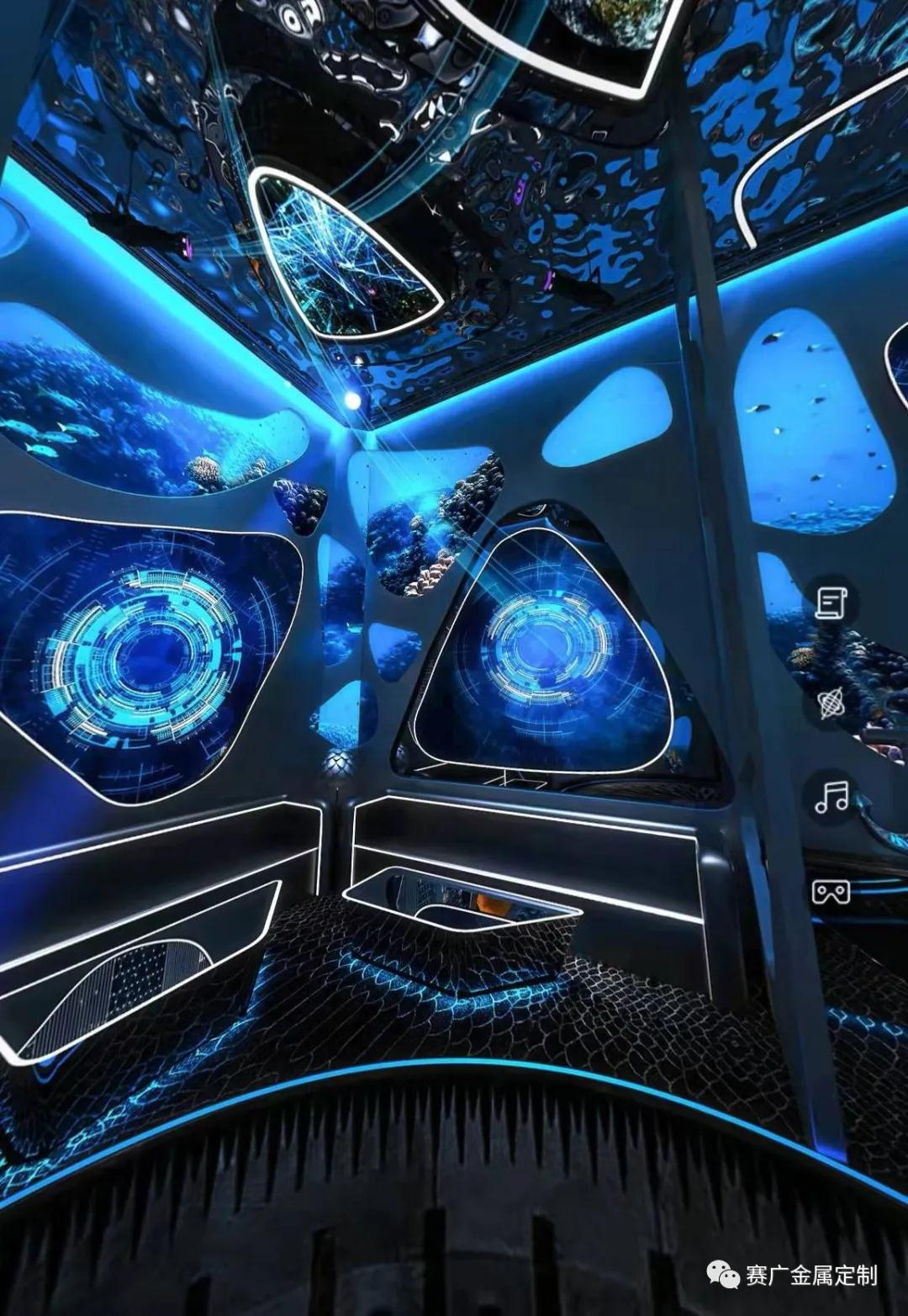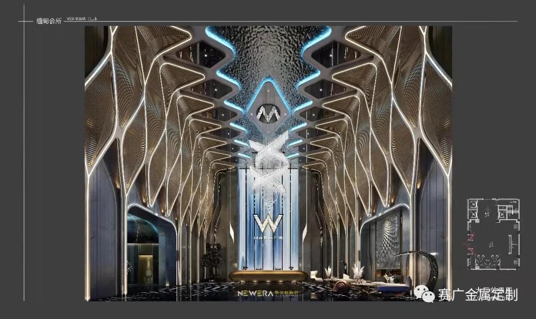 W會所是賽廣2021年最新合作(zuò)項目,位(wèi)於緬甸邦康,金(jīn)屬(shǔ)材料造價近500萬元,酒店主(zhǔ)題鮮(xiān)明,線條流暢(chàng),設計感非常強烈。古銅色的牆(qiáng)麵,及星空般的氛圍,引人入甚(shèn)。