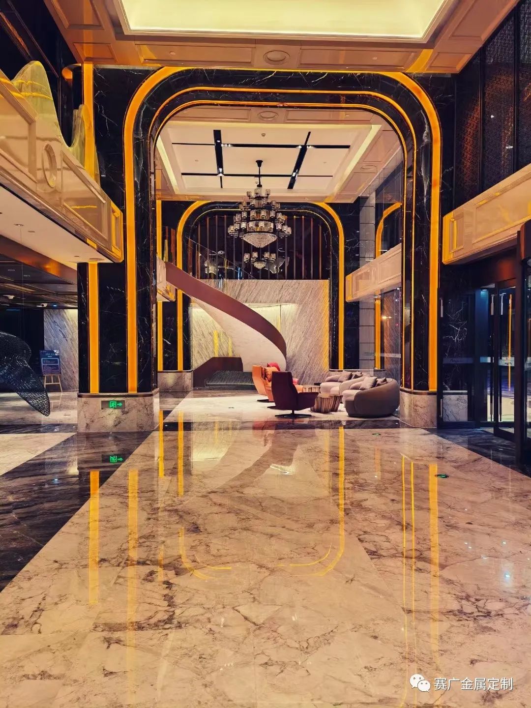 酒店大門,大量采用各類線條及圖形布局,結(jié)合(hé)各色燈光,在金屬的折射下,頓時琉璃(lí)效果(guǒ)顯現,置身於鎏金時空當中(zhōng)。