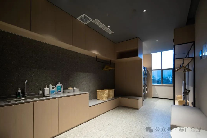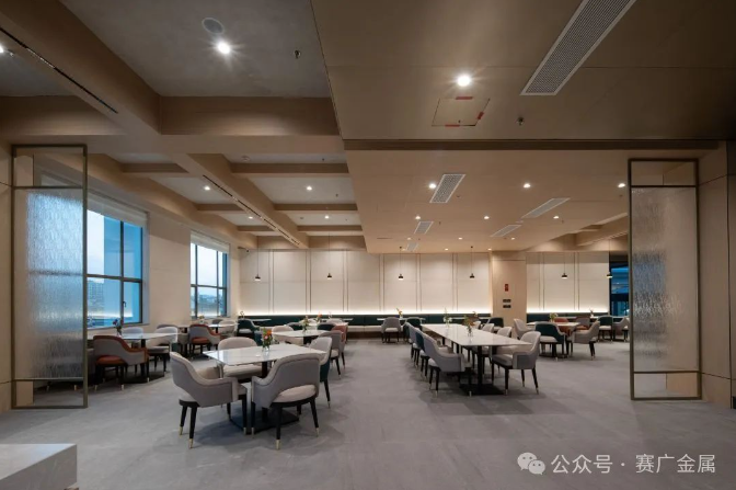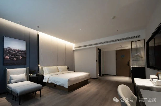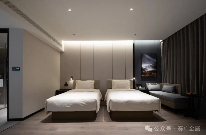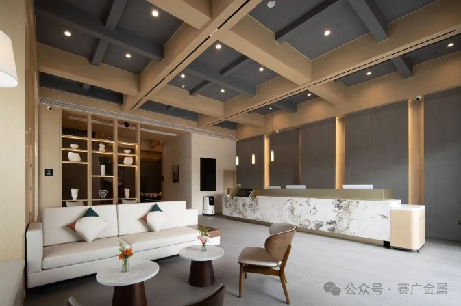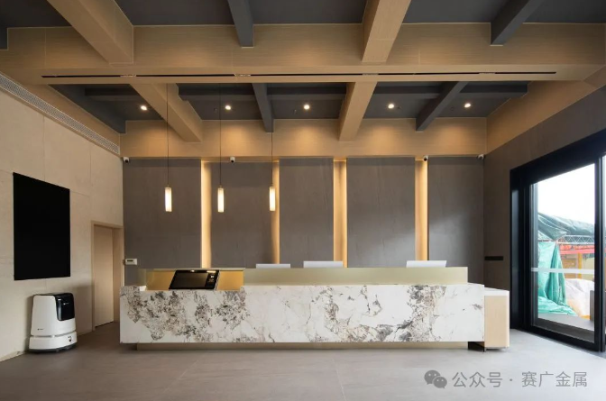 酒店內部古銅及黑鈦色調(diào)金屬包板顯得(dé)格外吸睛,錯落(luò)有致的排列貫穿全廳,古樸典雅,賦予空間溫暖與高貴的氛圍。