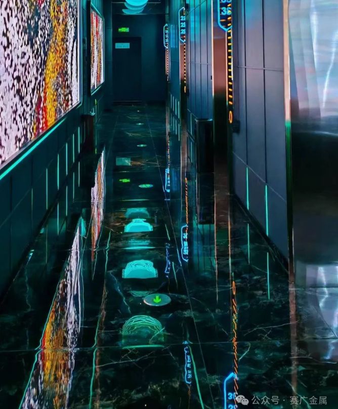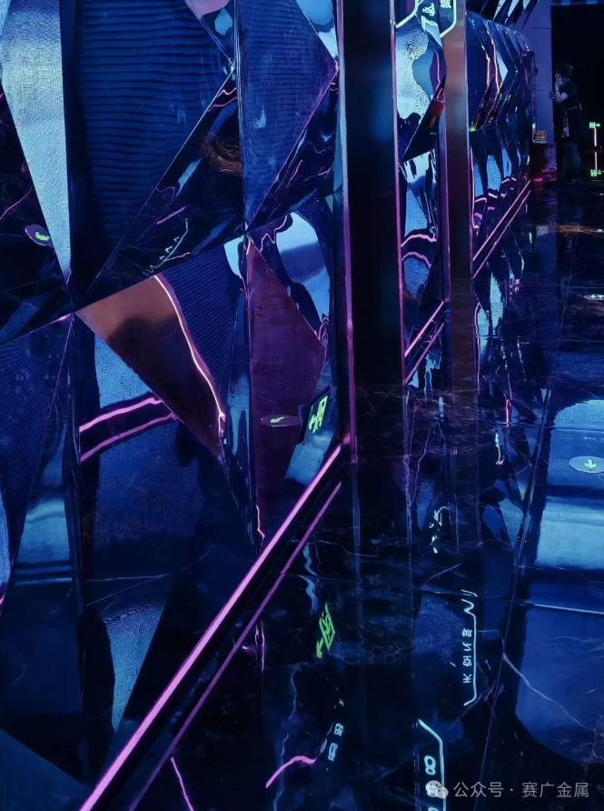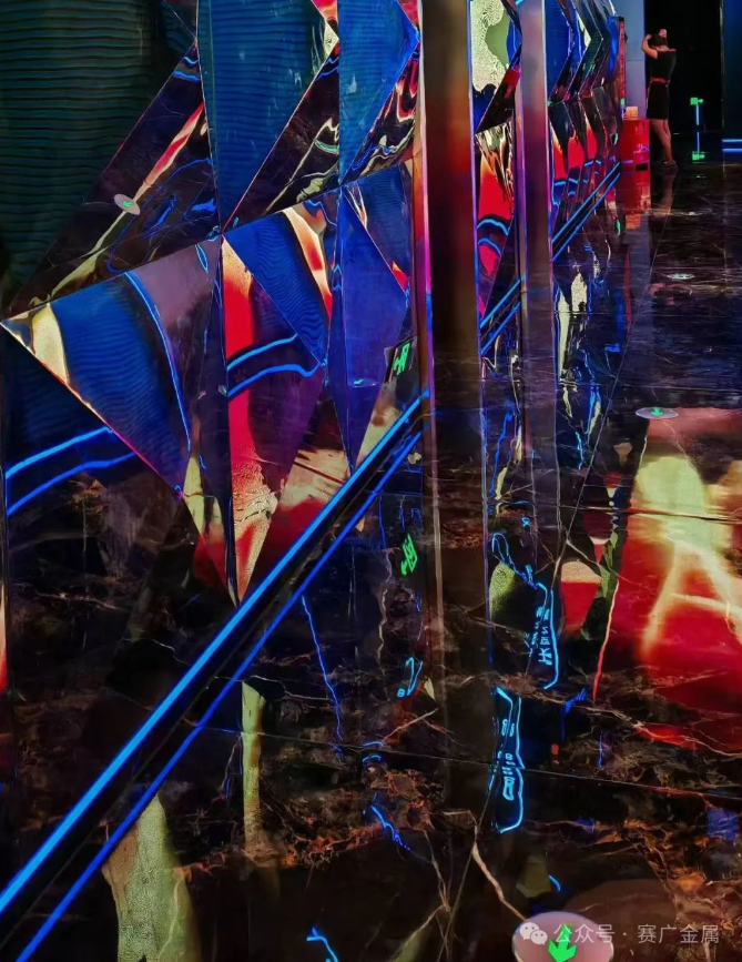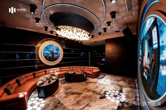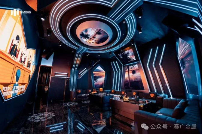 KTV金屬造型運用於牆麵和(hé)天花部分,起到裝飾(shì)和美化環境的(de)作(zuò)用,突(tū)出了KTV的主題和風格,頗有現代時尚風範。