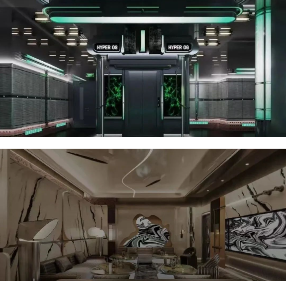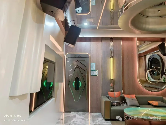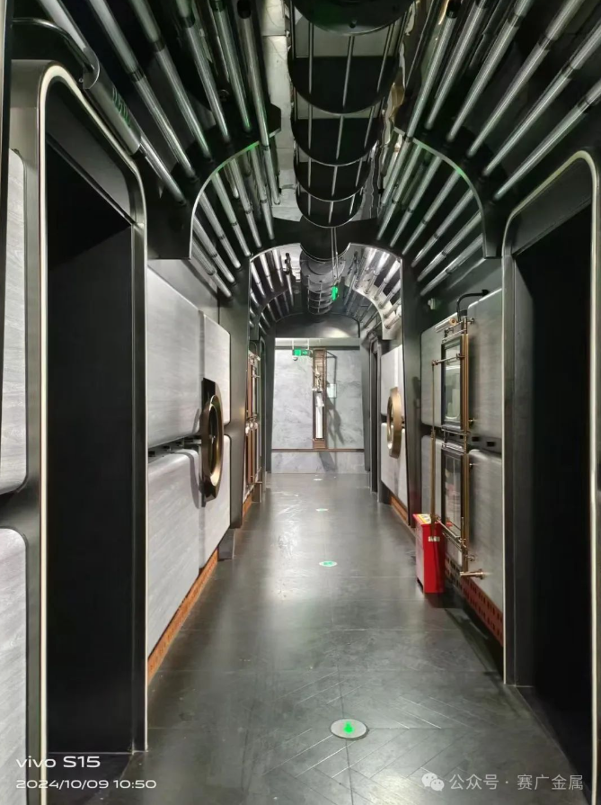 過道頂部金屬造型科技(jì)感強烈,營造出充滿未來感的空間形態,拉伸空間的同時又給(gěi)人以時尚潮(cháo)流的(de)感(gǎn)覺(jiào)。