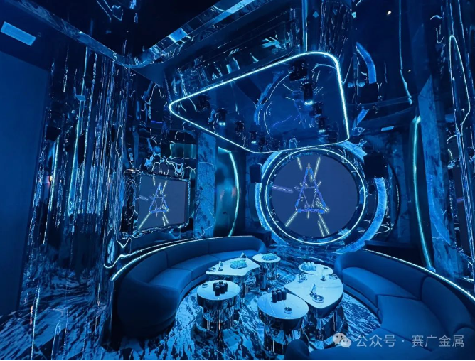 利用金屬搭配出多種不規則幾何造型,能營造出強烈的科技感。燈光以冷色調為(wéi)主,頂麵(miàn)設置的星空投影,恰似漫步宇(yǔ)宙。