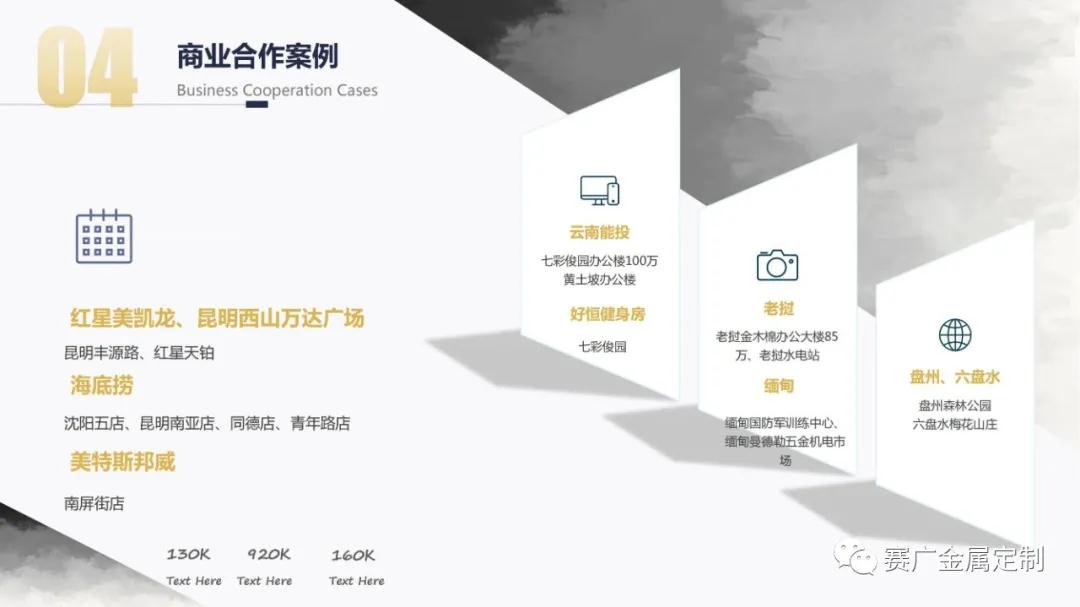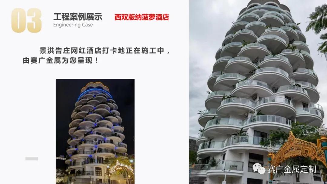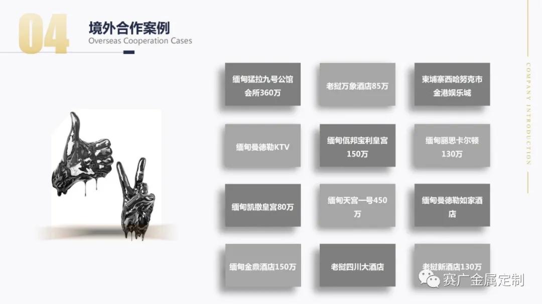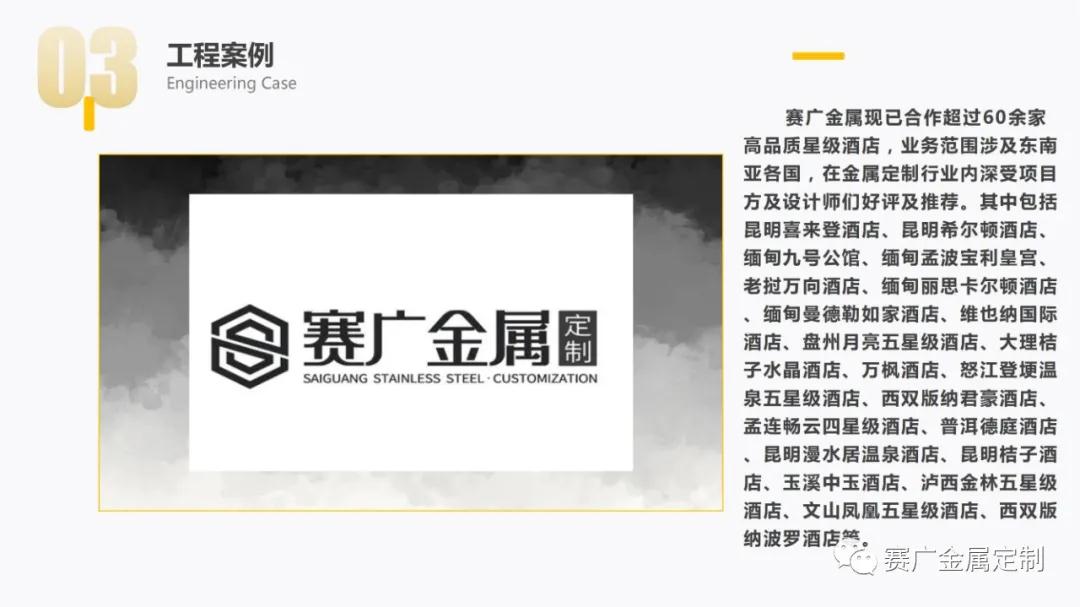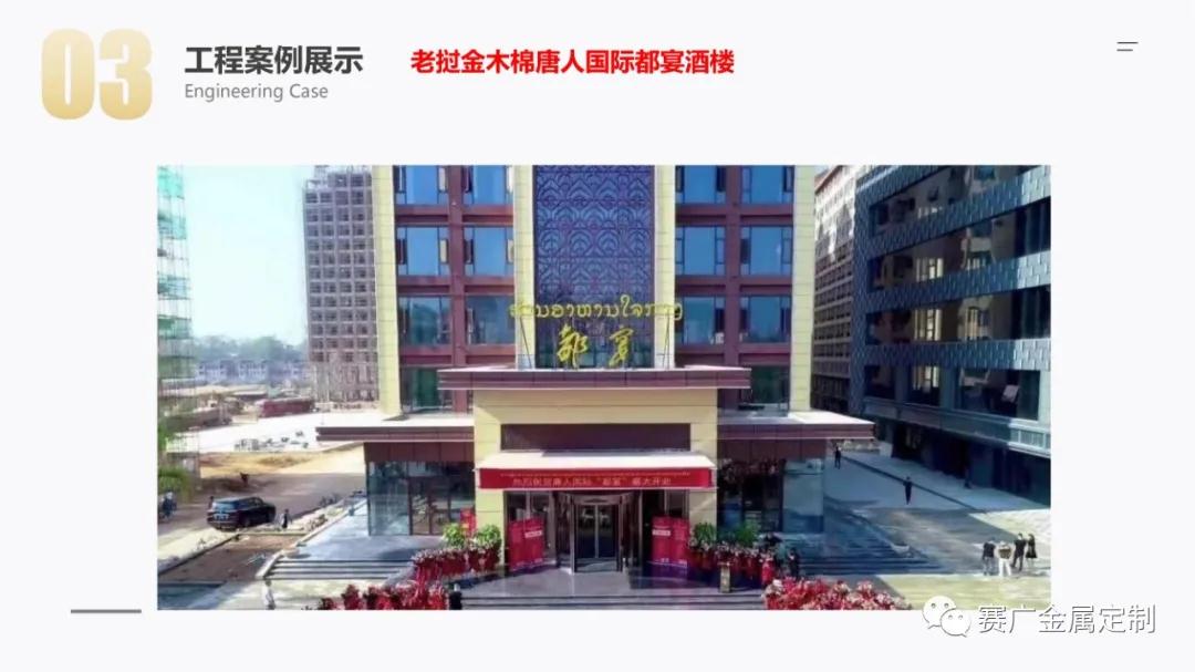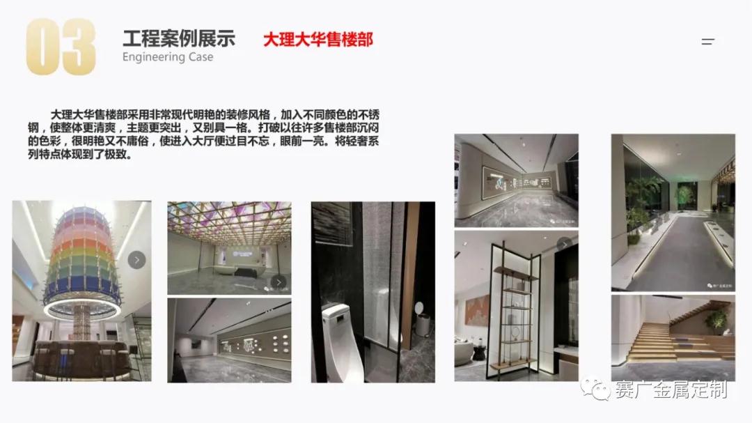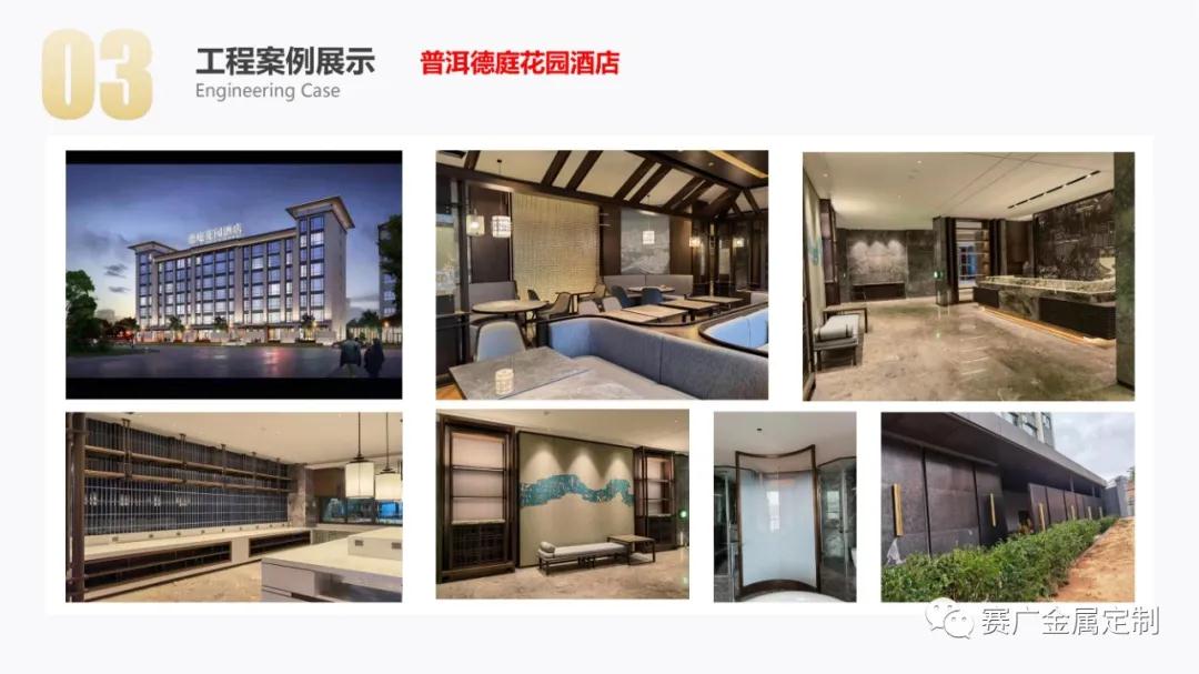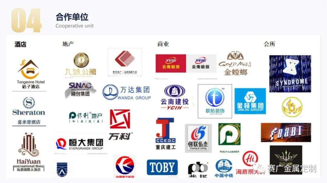 如今,賽廣產(chǎn)品(pǐn)銷往全國各地以及東南亞國家。合作過(guò)“海底撈,喜來登酒店,俊發地產(chǎn),中鐵置業,緬甸九號公館”等上百餘家企業。用無數的案(àn)例驗證了實力,讓賽廣成為中(zhōng)國金屬(shǔ)定製行業的佼佼者。