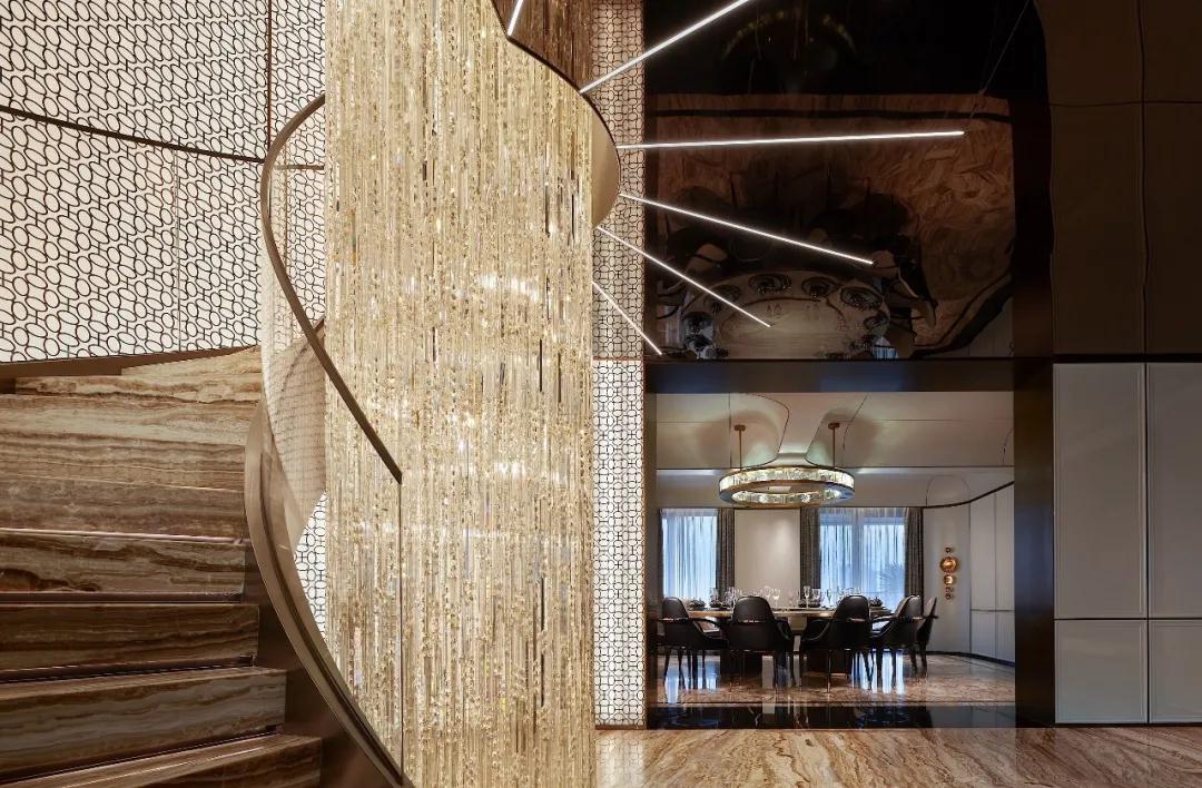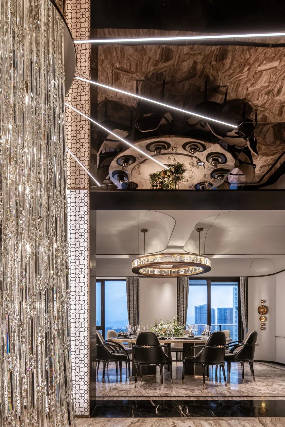 玄(xuán)關,猶如機械般的將空間切割為二,巨型施華洛世奇水晶藝術裝置貫穿一、二層,仿佛巨木拔地而起,流光順“樹根”向上生長,華麗與(yǔ)自然並存,賦予空間強大的生命力,璀璨不息。客餐廳被分立兩邊,設計風格的多元性,矛盾性沒有被刻意隱藏(cáng),相(xiàng)反,強烈對比之下空間以兩種姿態和諧共(gòng)生。