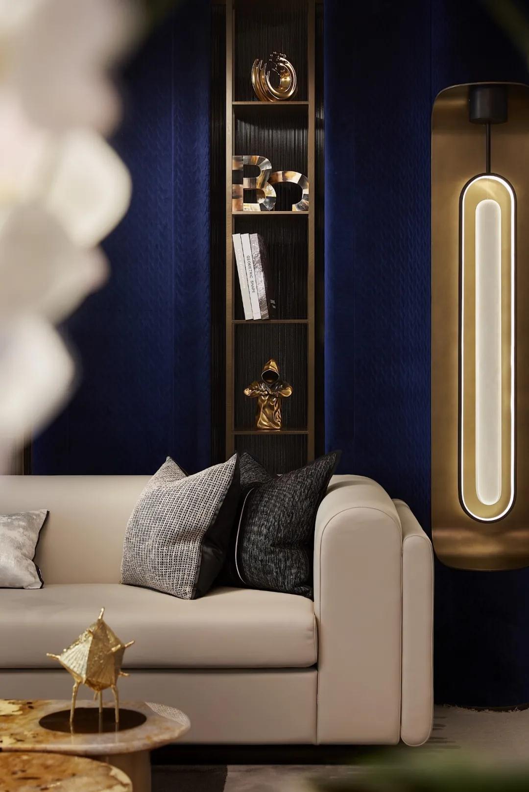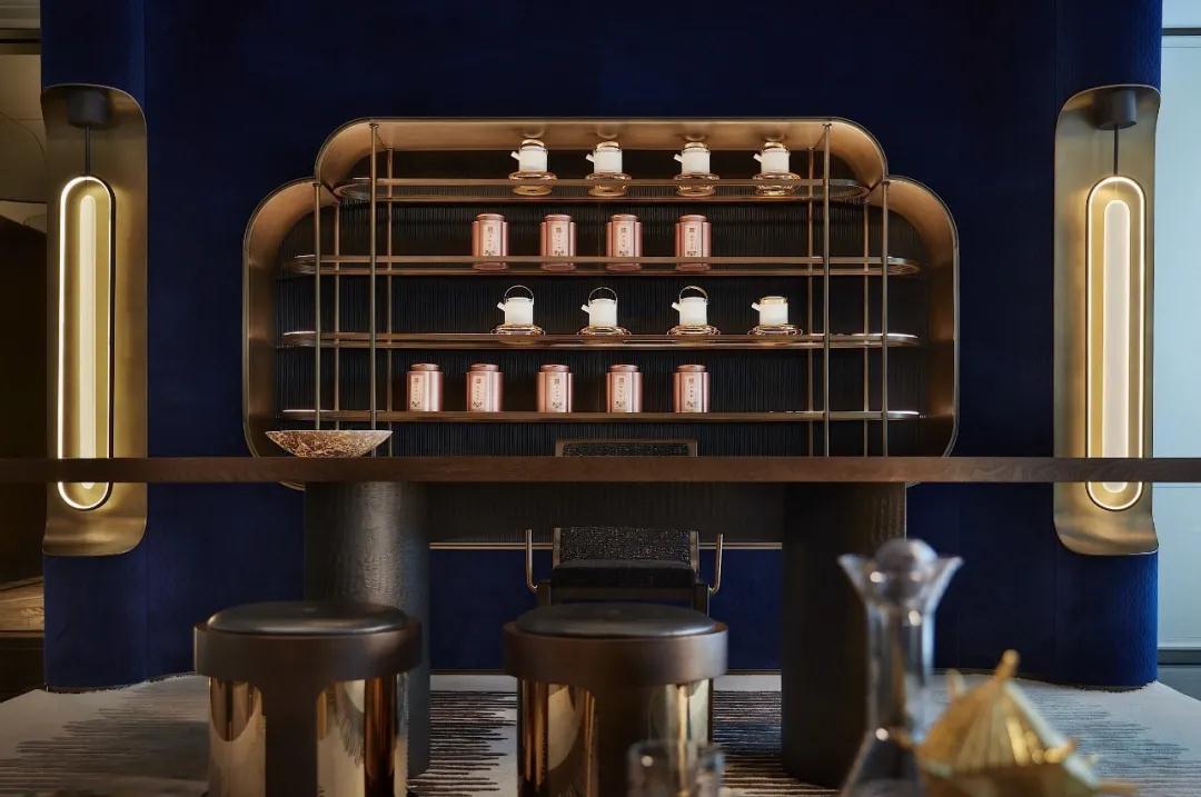 同(tóng)樣,茶室蘊含著中外古今的精粹,擁有超然物外的自然舒適,延續設計手法和對稱美學,在色彩和特殊紋理上(shàng)表現構造意向空間,藍色色調、金(jīn)屬細節、材質變化的具象(xiàng)詮(quán)釋,直觀地(dì)表達新時代下,東方(fāng)美學意(yì)境和現代都市的物化藝術之間的(de)融合。