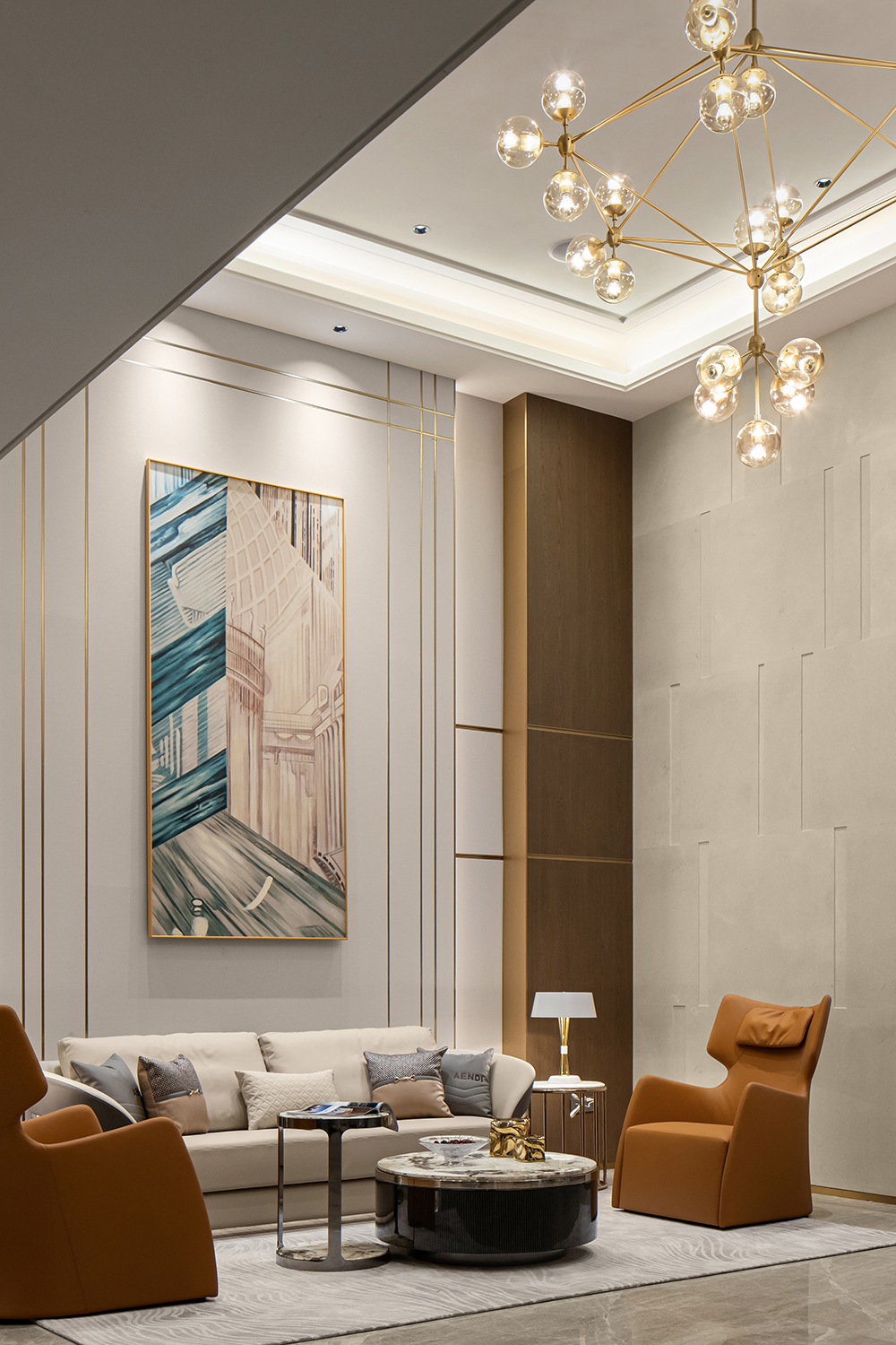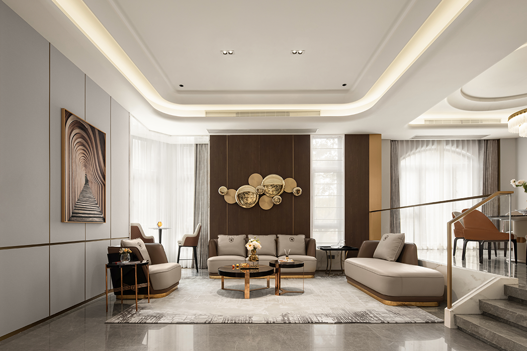 開放融合的客廳以米灰與棕咖為主題色,配以(yǐ)亮麵金屬點綴,在自然光影與燈(dēng)光的協調下,通過紗簾把適度明朗的空間氛圍緩緩拉滿,生出層次的美感。弧線圍合的家居造型與頂麵天花(huā)交(jiāo)相呼應,呈現穩重典雅的精神氣韻。