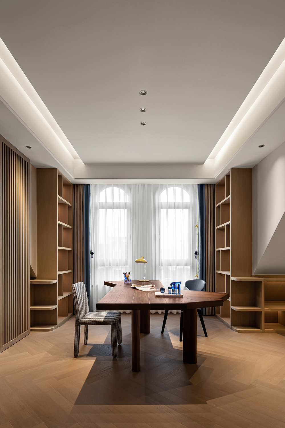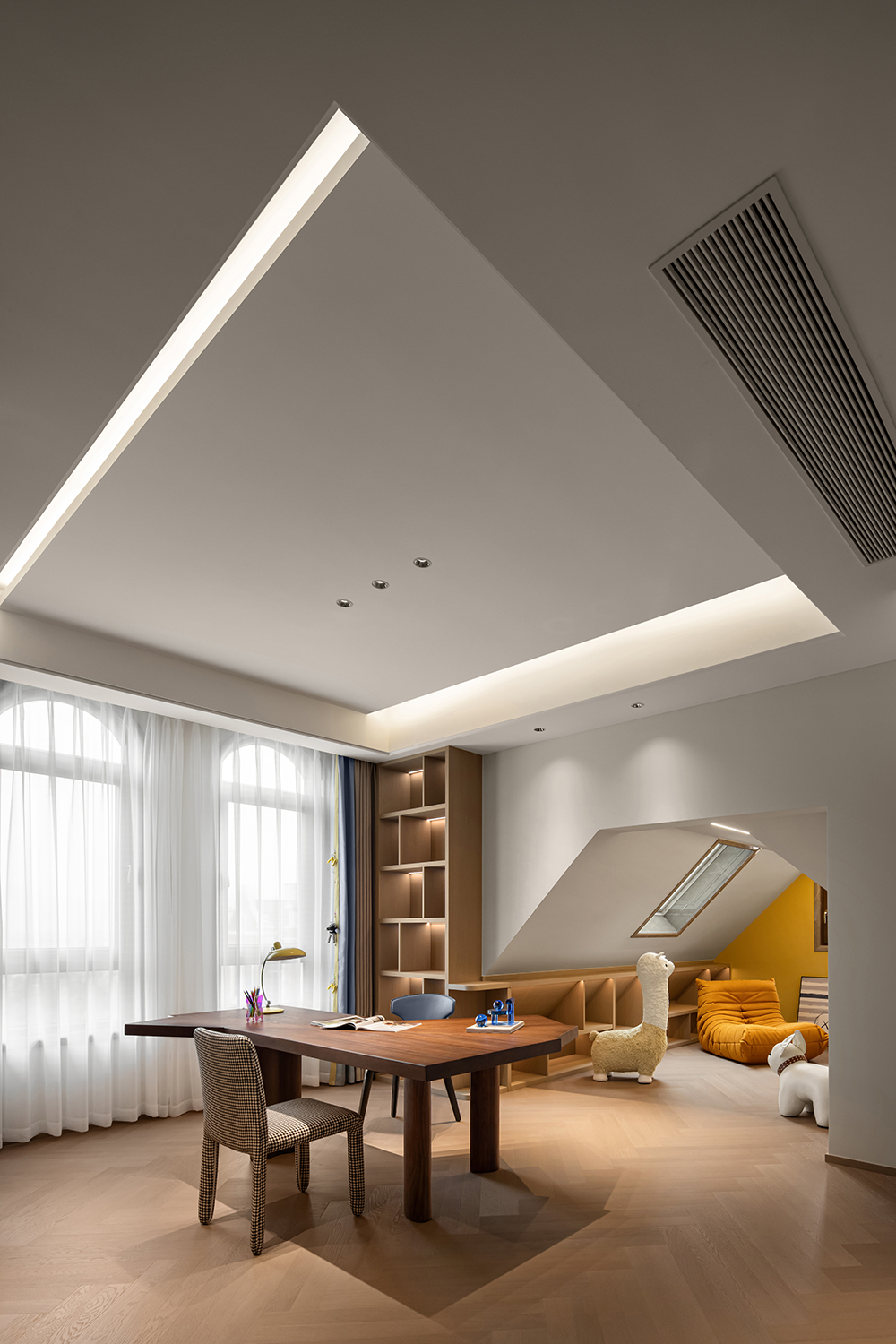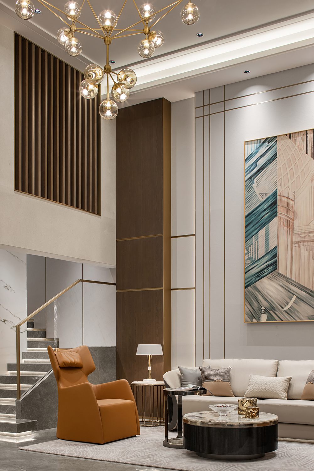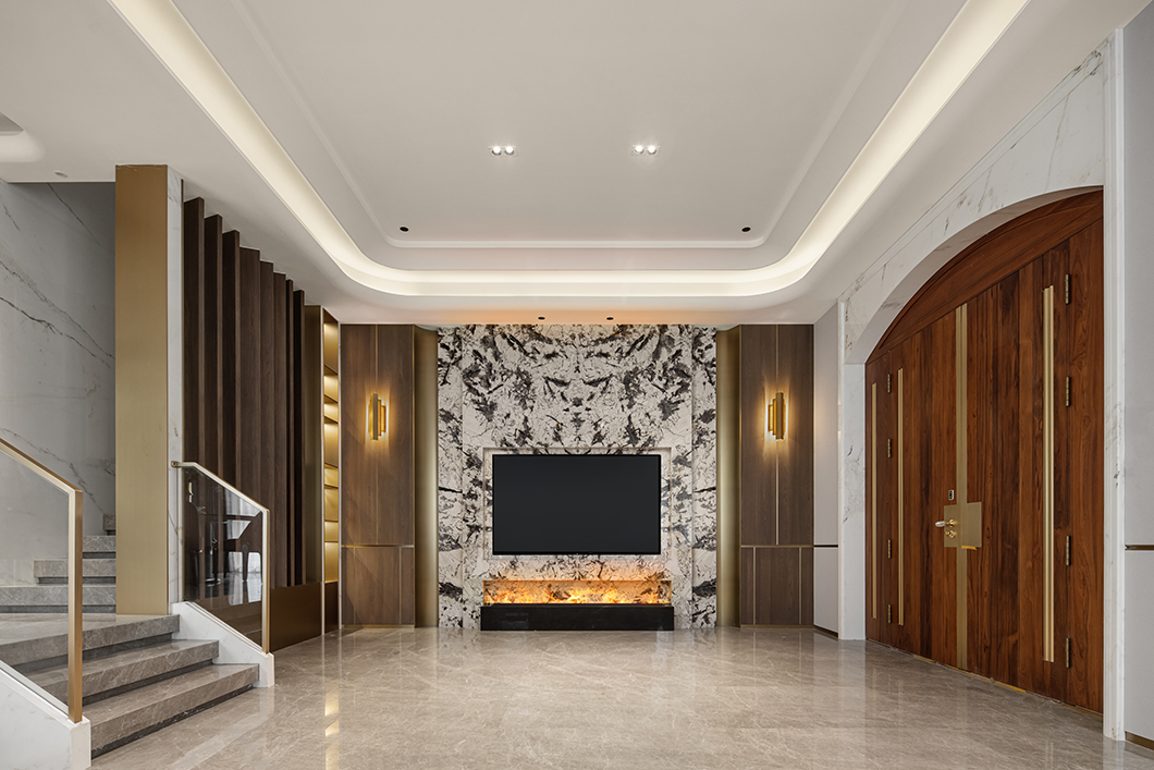 在感(gǎn)性與理(lǐ)性中探尋空間的美學定義,享受統一色係(xì)帶來的寧靜。二層主臥用疏密變(biàn)化的線(xiàn)條展現節奏的韻律,整(zhěng)體流線形的(de)家居設計,勾勒出現代輕奢的個性氣息。