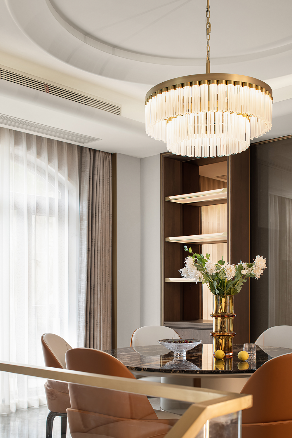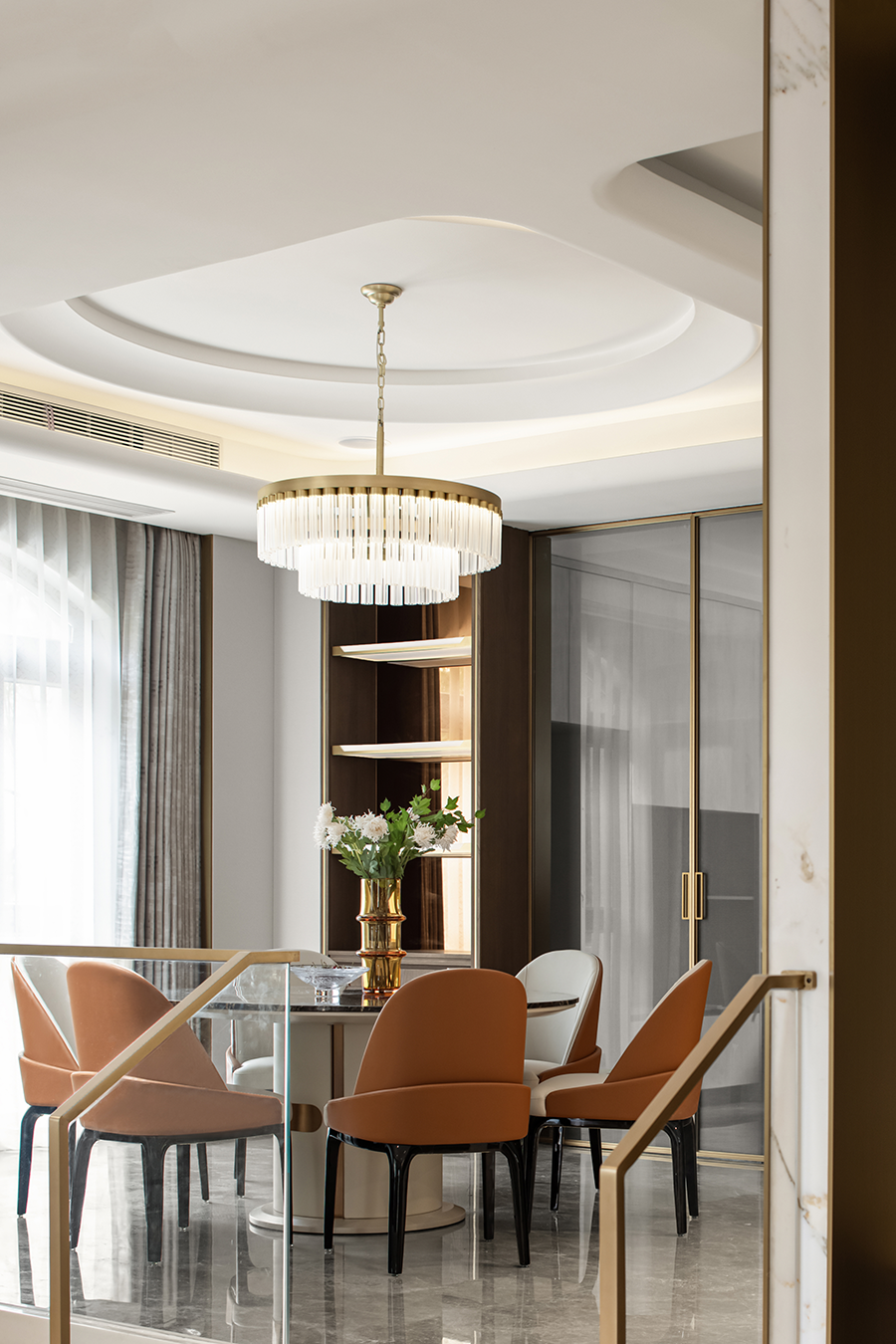 餐廳匯集家人團聚的歡融體驗,作為一天美味私享的空間,呈現最具(jù)煙火氣的生活景象。自帶溫度的橙色與黑金奢石台麵冷暖互補,中和出舒適的餐(cān)區(qū)溫度。質感吊燈,通透器皿與藝術雕(diāo)塑的加入,衍生出家居陳設的多元可能。