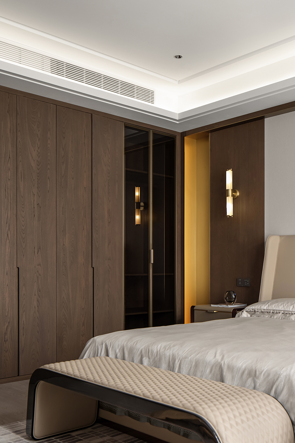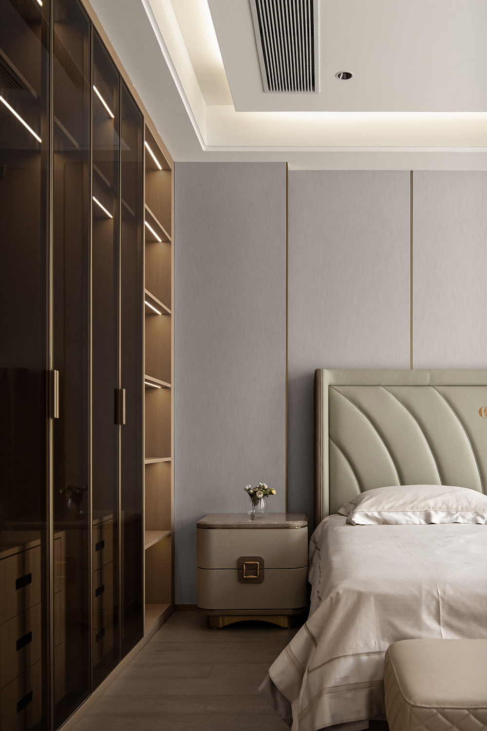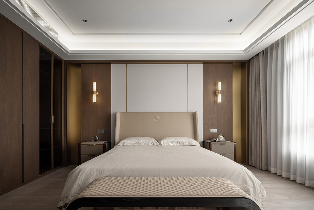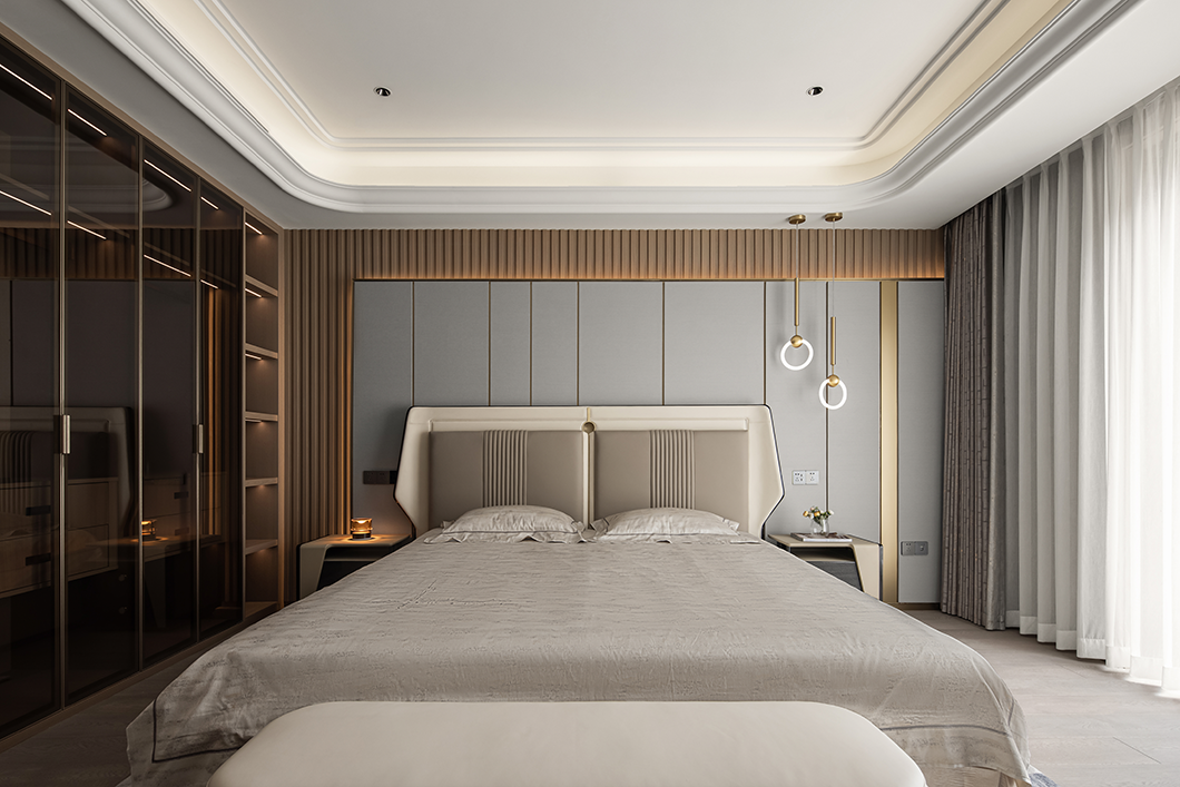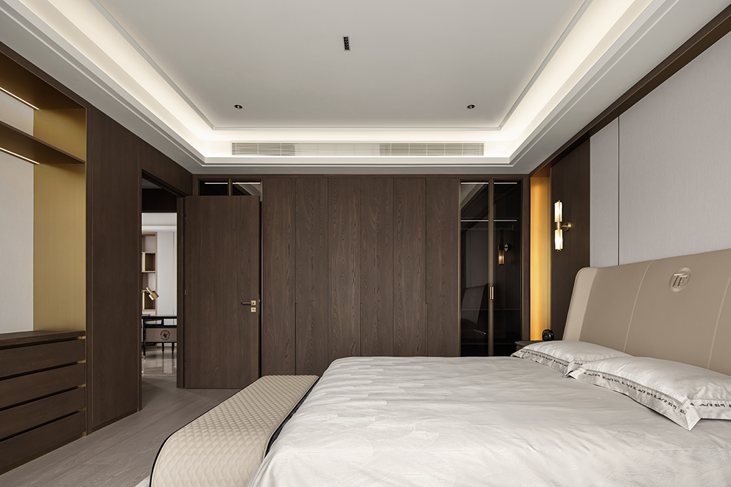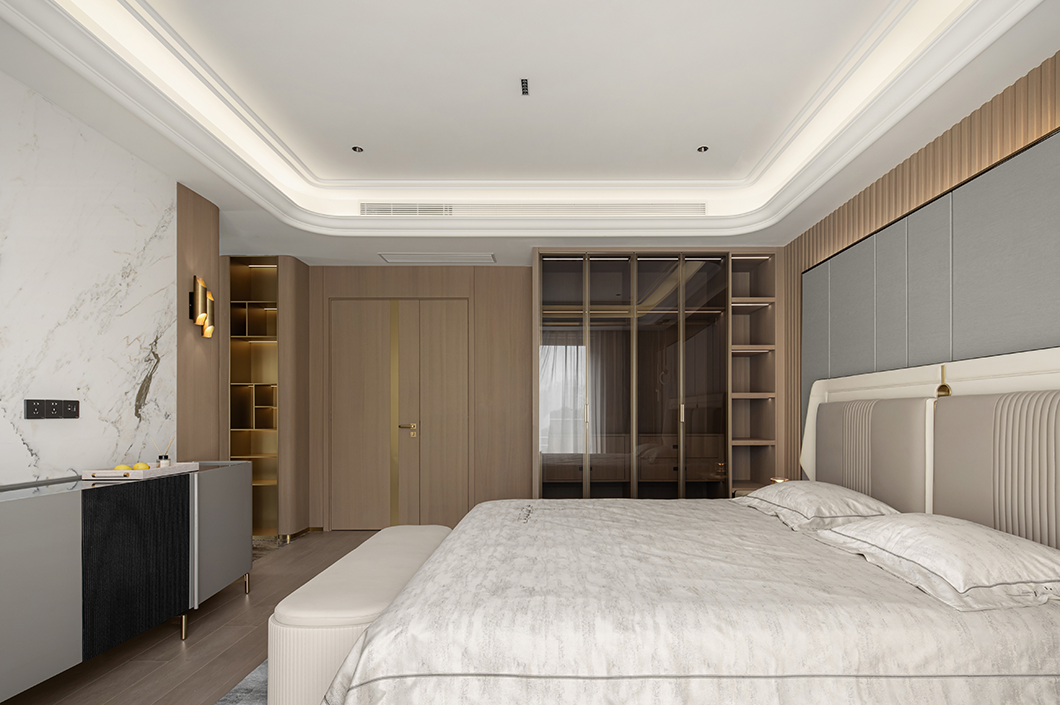 在輕奢的統一語境(jìng)下,衣帽間,主衛與主臥設計基調(diào)貫穿統一,內斂溫(wēn)潤的木飾,啞光質(zhì)感的金屬與通透一體的玻璃搭配利落整體,摒棄複雜的裝飾與色彩,享受獨一無二的(de)奢雅與舒適。