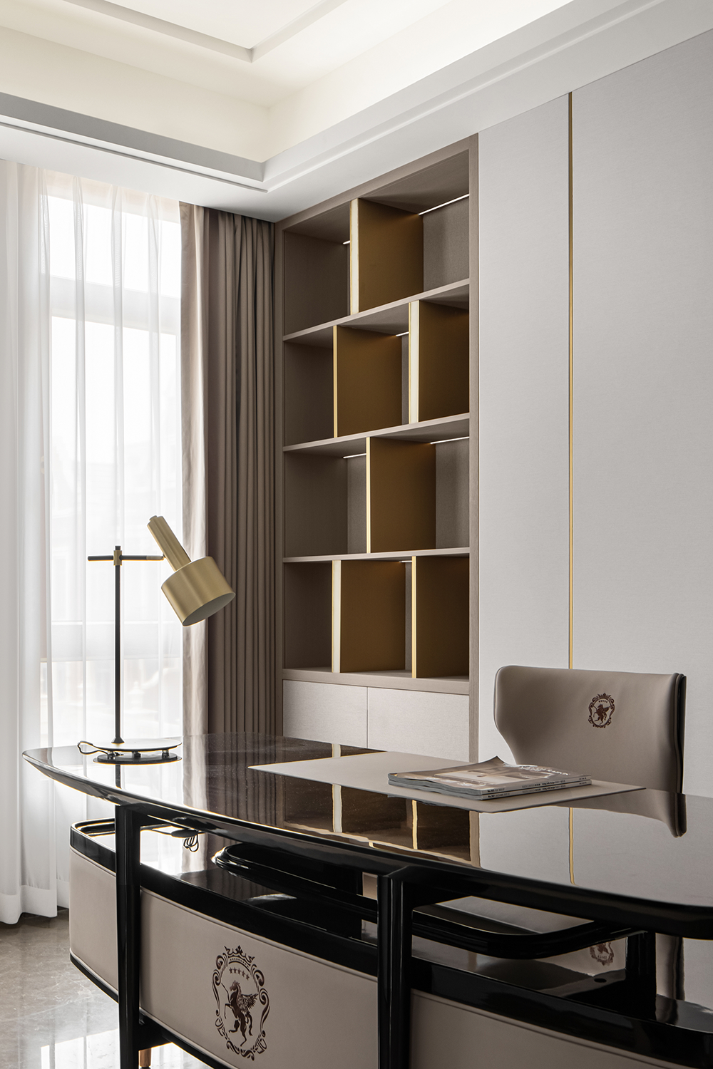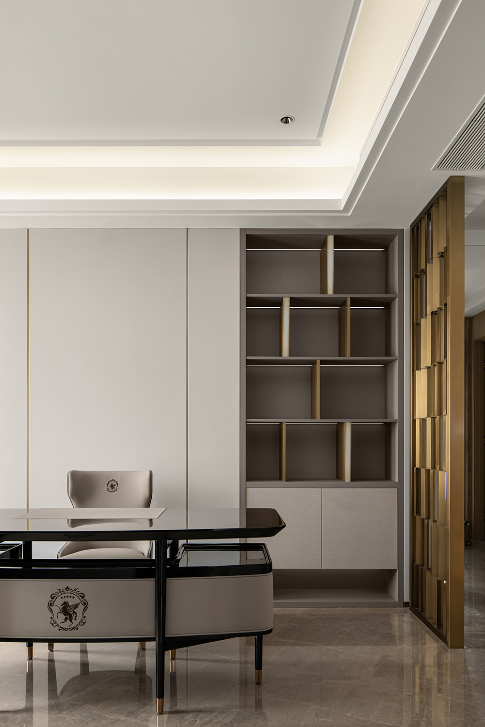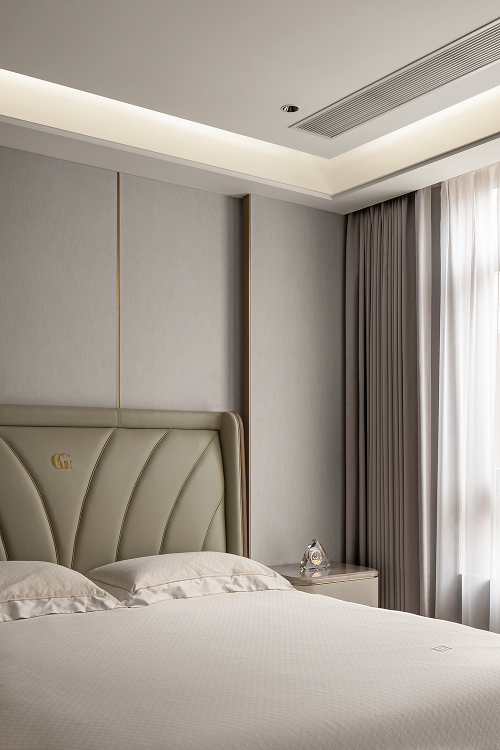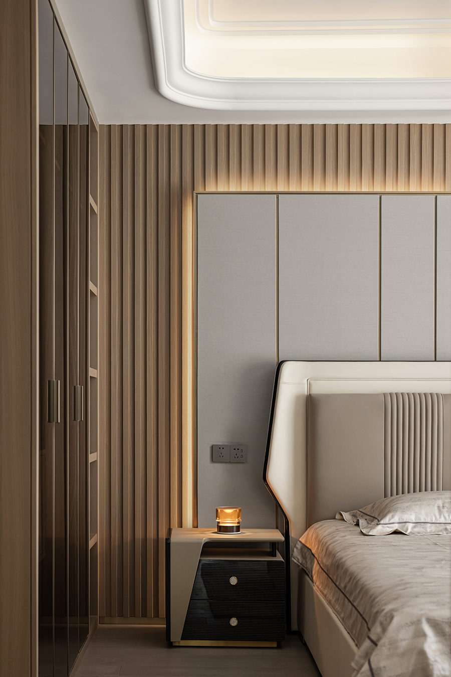 在輕奢的統一語境(jìng)下,衣帽間,主衛與主臥設計基調(diào)貫穿統一,內斂溫(wēn)潤的木飾,啞光質(zhì)感的金屬與通透一體的玻璃搭配利落整體,摒棄複雜的裝飾與色彩,享受獨一無二的(de)奢雅與舒適。