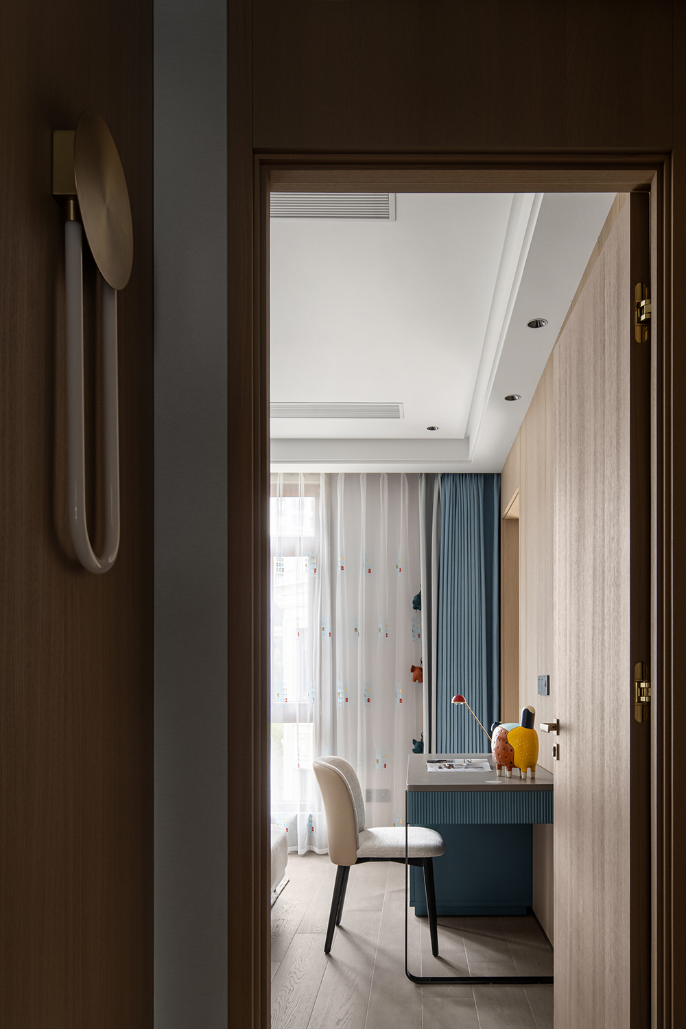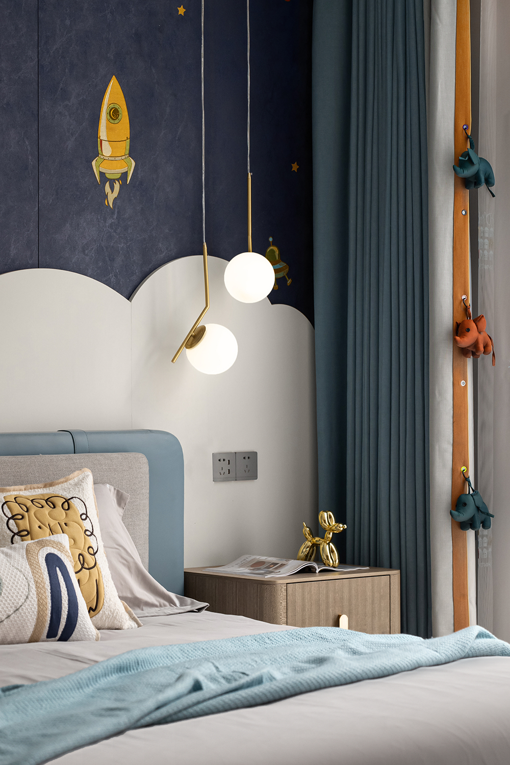 兒童(tóng)房以“造夢”為設計主題,深淺遞進的(de)藍色滿(mǎn)足小男孩對未知(zhī)星空探索的想象,趣味的(de)動物元素豐富了關於快樂星球的趣味遐想。活潑的兒童空間搭載著小朋友稚嫩而精彩的夢,還原(yuán)了孩子應有的天真爛漫。